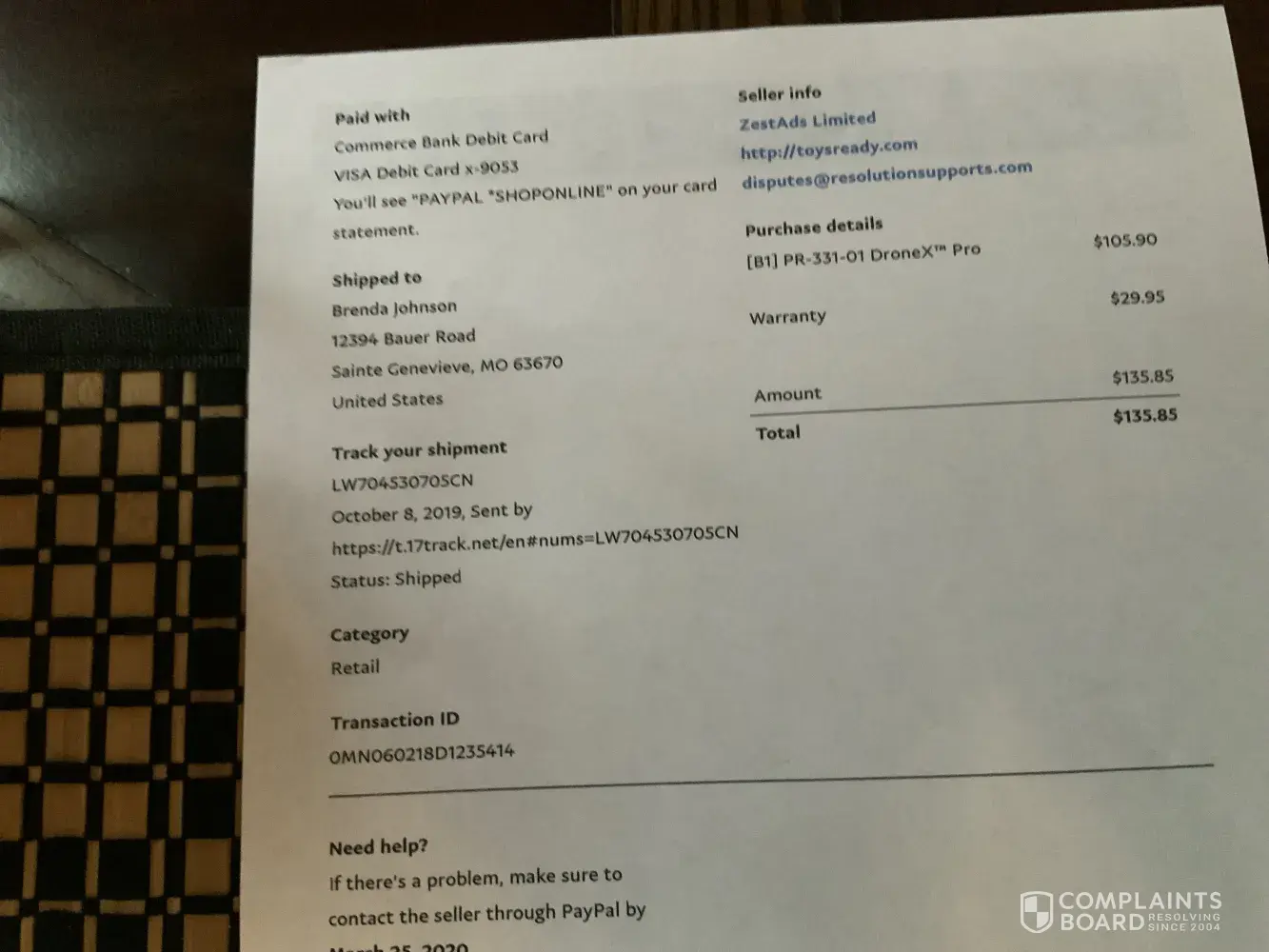 Next day I received an email from PayPal stating they closed my case because I did not give them a tracking number for proof of return. I phoned PayPal and asked why they didn't give me a tracking number to return it, as I explained to them I received no paper work when the Drone arrived. PayPal will not reopen my case or drop ZestAds Limited Hong Kong as a customer. How is PayPal a secure and safe service to use? I still want my money back