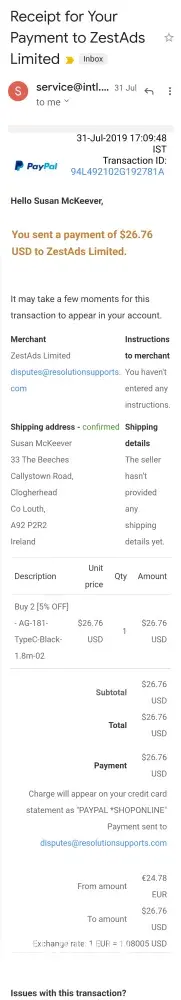 Ordered two of these virtually unbreakable phone charging leads and payment went through PayPal on 31st July 2019. It's now October and no goods delivered and the shipping/tracking information never came either. I want a full refund of the $26.76 immediately please and an explanation would be good too. I attach proof of the payment, the company. product and transaction number with dates below.