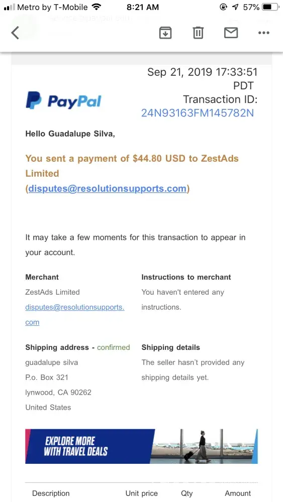 I ordered slimming patches on 28 th August and never received them. I started a dispute on PayPal. I paid £30.40 pence including warranty which do not know what that is about. I escalated with PayPal and unbelievably they ruled against me. I am out of pocket and have nothing to show for it. I feel really let down by PayPal. That is the reason I use PayPal I thought it was to protect the customer. They say it was delivered on 10 th of September. I had tried tracking but there was no information. Zest ad looks to me like they are scammers. I feel stupid for not checking them out. I will be more careful in future