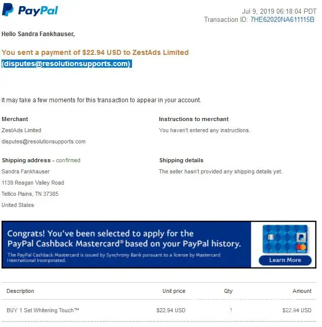 Placed this order on July 9th and paid with PayPal - Transaction #7HE62020NA611115B. I never received a confirmation, have not received the item or a possible shipping date yet it appears they have my money. I contacted PayPal to dispute this purchase and have heard nothing back. I have also sent 2 emails to [protected]@resolutionsupports.com which I assume belongs to ZestAds Limited since it is under their name on my PayPal confirmation. I either want to know that the item is being sent and when OR my money refunded.