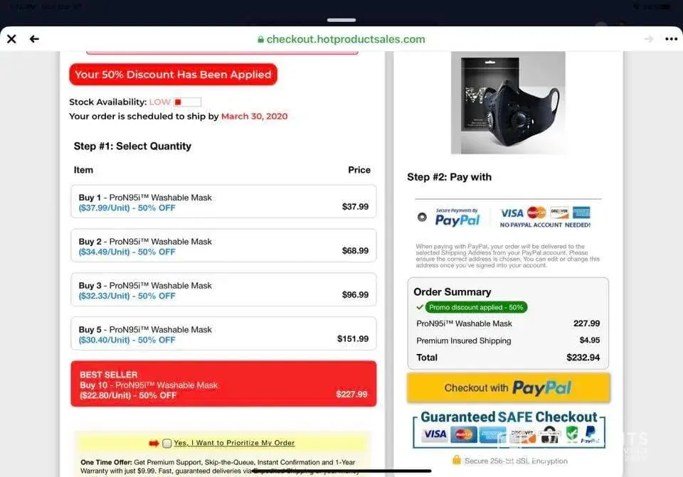 Ordered and paid for through PayPal 10 masks on 4/1/20. Included an extra fee for expedited shipping...total charges $242.93