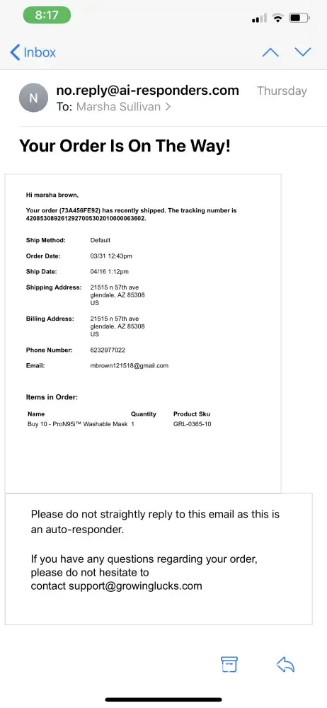 The email did not have a header or any phone numbers to contact them. At the same time I noticed no reference of carrier being used, misspelled words and that it was being shipped to an old address, which I did not enter.