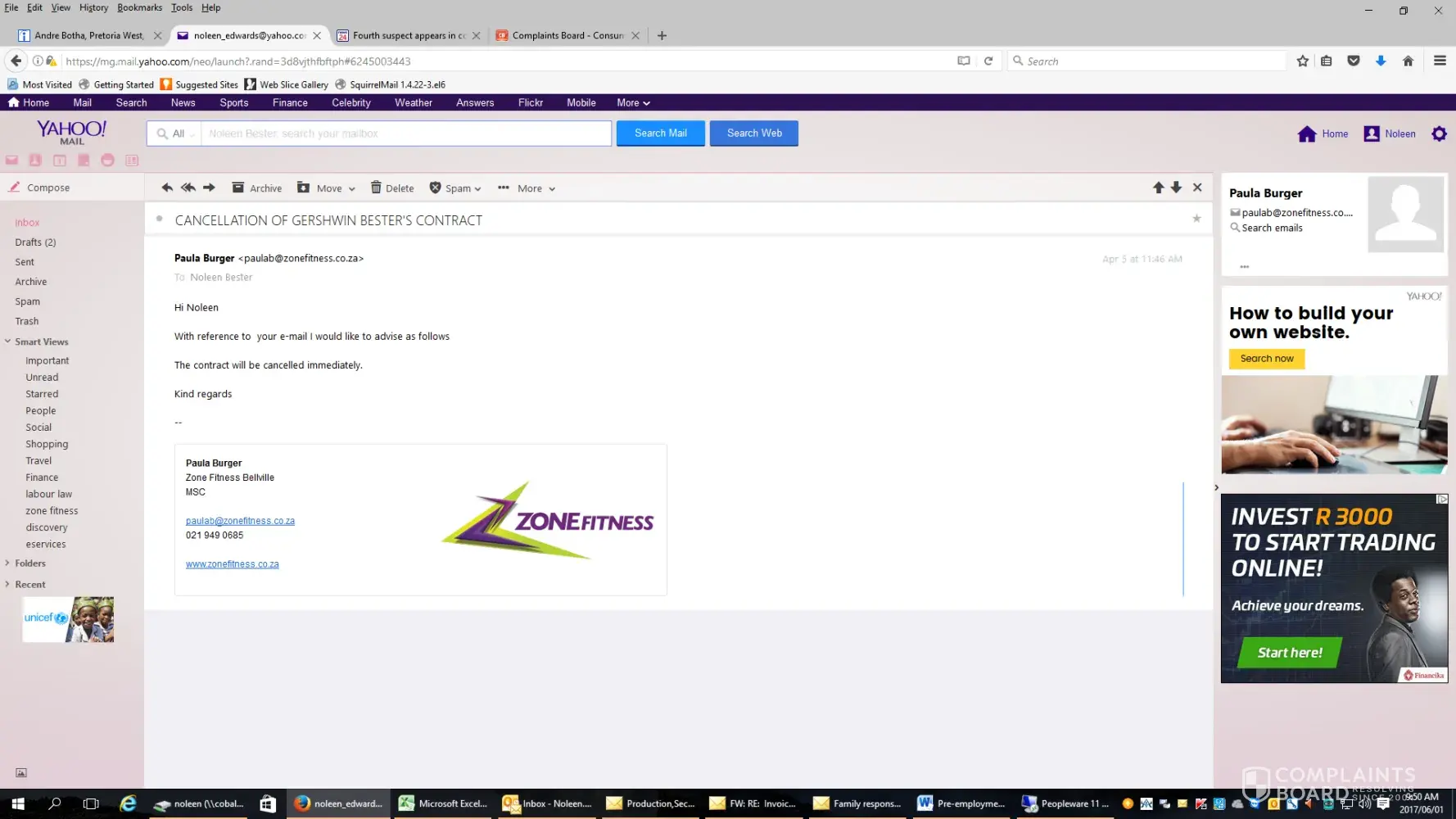 Last Year we went to Zone Fitness to take out a Contract. We spoke to A Sales Agent name NANCY and we did advise her that we did not want a long contract as we were planning to go back to Durban. Anyway after a month I sent a email stating my daughter is leaving and she should be removed from the Contract which was done. We told Nancy next month we are leaving so she gave me an email address to send A CANCELLATION of contract which I did. There after Ellen replied stating if I am cancelling I need to pay 60% of the contract. I was upset and asked her to get Nancy and she must call me. Nancy And Ellen called me and Nancy did inform Ellen my claims are correct so Ellen stated everything is sorted out. No contact was made after that so I knew everything was sorted until yesterday I received a sums from A Lawyer stating I owe Zone Fitness money . I called the number and was by the lady Zone Fitness has handed you over
