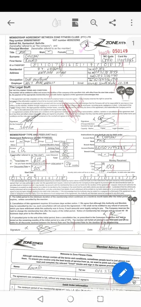 Good morning. Firstly my partner and I are very upset with the way Zone Fitness treated us. Your membership consultants are the most untruthful people in the gym industry. On the 30th of March 2019, I was approached by a consultant at Suncardia and I was offered a new membership offer which I was told was a promotion called "upgrade". The consultant told me that if I join with a partner the gym fee would be R300 for both of us and I would start paying the next month on the 29th of April. I was impressed with the offer and since my partner also wanted to join, I agreed to it and signed the two-year contract with them. I purchased the cards and got the contract forms. I was then told, my partner should come to confirm the membership. When my partner came the consultant told him that his card was inactive which means our membership has been cancelled and we had to come again together to sign another contract and get new cards, and so ceased his card. Since we are both students and couldn't make time to come together we thought we should leave it since our membership was cancelled. We relaxed all the months thinking everything was fine plus I got my allowances in total meaning the account was not debited. Then on the 26th of June when we were on the holidays I got a notification indicating a debit order from Zone fitness and I thought it was a mistake since they had my banking details. I then decided to reverse the order since I needed to use the money and I was not around PTA to enquire. After the recess, I told my partner about the debit order and he suggested we come. We went yesterday on 30 July 2019 and when we got there the receptionists told us that our membership was active and that we owe an amount of R1720 to the gym. She said that the debit orders were bouncing because my account had insufficient funds. Even if that was the case, my partner and I would have paid using cash if we were using the gym. The consultant lied to us telling us that our membership had been cancelled and even took my partner's access card so we refuse to pay an account which was not explained properly, we are students and we don't have such huge amounts of money, we also want the contract cancelled and we still refuse to pay any cancellation fee for a contract that never existed to us. We are very unhappy and furious with the services rendered by the consultants.
