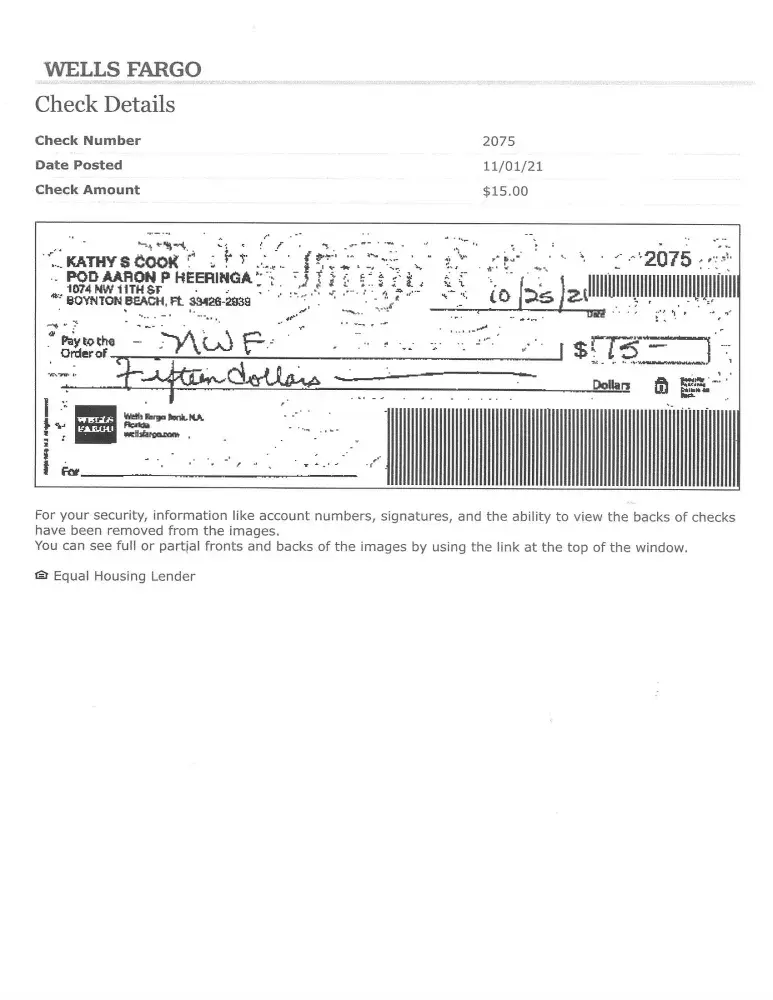 Please return my payment of $15.00 Ck# 2075 cashed on 11/1/2021