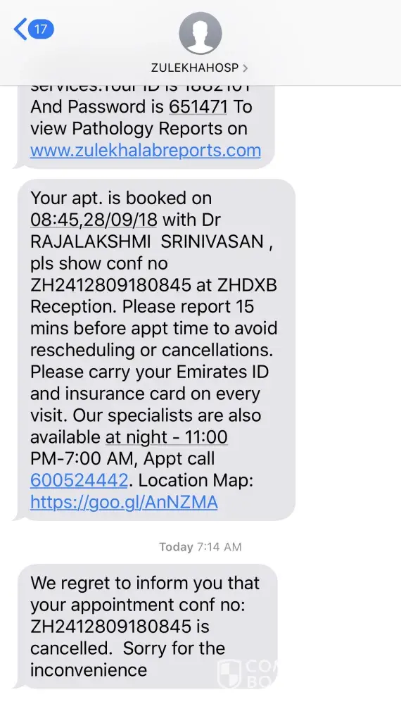 I had taken a appointment with the gynecologist on 24th September for 28th September at 8:45am, I also received a confirmation sms.