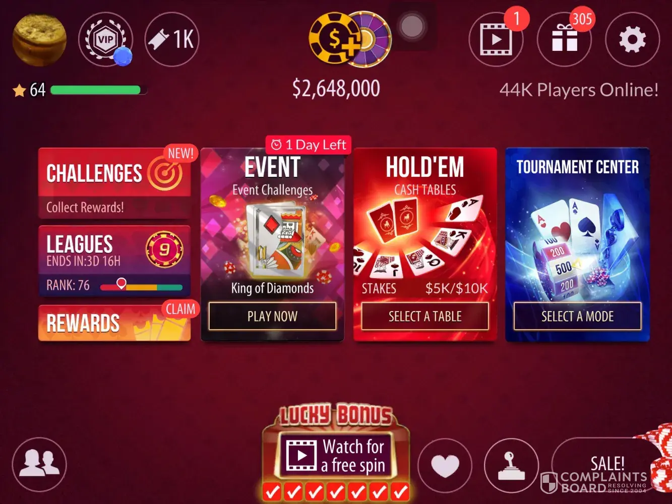 There is a section balled challenges, and it claims once you complete the challenge you will receive, in my case, 6 trillion and a second challenge, 262 billion chips. I have screenshots before and after completion. I never received those chips and wrote their support. They gave some off the wall answer that did NOT explain my concern. I then wrote a letter with attachments to their chief legal officer. No answer. I filed a complaint to their BBB. The answer I got this morning said they resolved the case. A total lie. I have told the BBB that was an unacceptable answer and included my attachments.