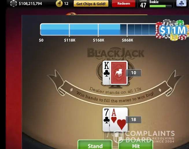 This makes four times, that I have been ripped off, just within the last 3 weeks. I complained to zynga on facebook, and they did nothing. I spent money to buy gold, and win chips. I played blackjack... 21 blackjack is the game I played, and when I win, it says sorry you lose, do you want to start over. I stupidly deleted the other screenshot, because I mistakenly thought the only place I could complain was on facebook. twice was where it froze, and I had to start over and again twice this has happened where I won but it said I lost I honestly, expect to be reimbursed. see for yourself. the one where it doesn't say anything is where it froze. the other you can clearly see, I was ripped off.